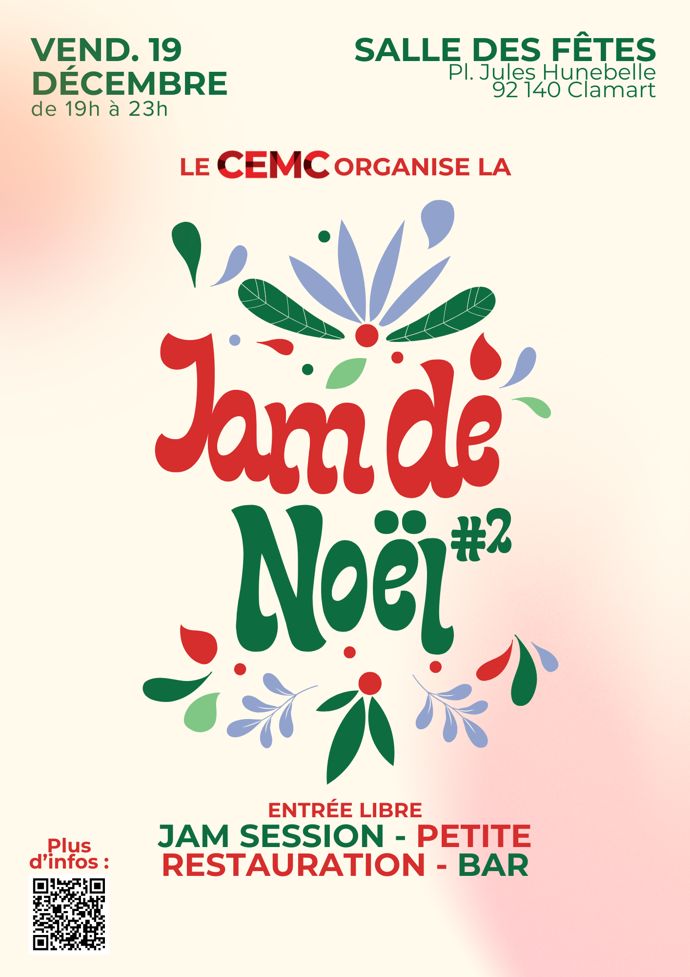 Le vendredi 19 décembre à partir de 19h, le Cemc organise pour la deuxième année une grande jam de Noël à la salle des fêtes de Clamart ❄️