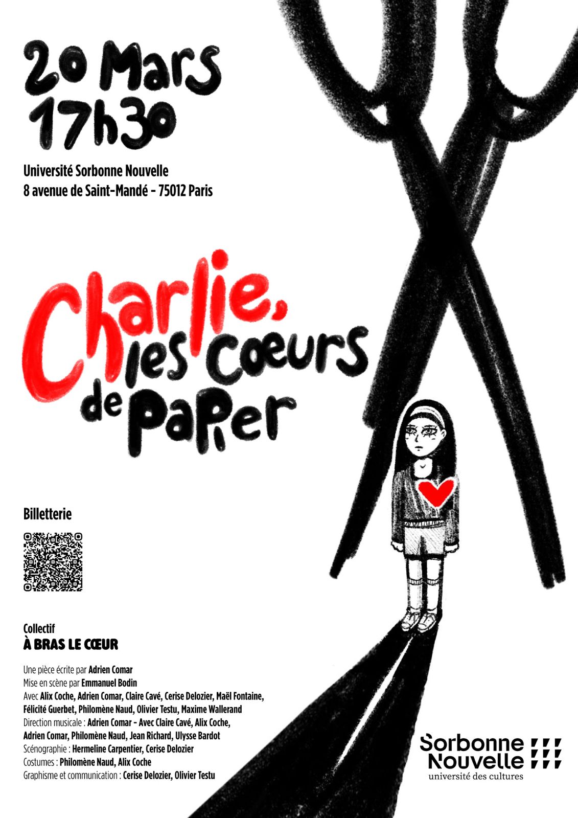 La troupe de théâtre du samedi matin au CEMC a le plaisir de vous convier à la représentation de sa pièce, « Charlie, les coeurs de papier », le vendredi 20 mars à 17h30 au Théâtre de la Sorbonne Nouvelle.