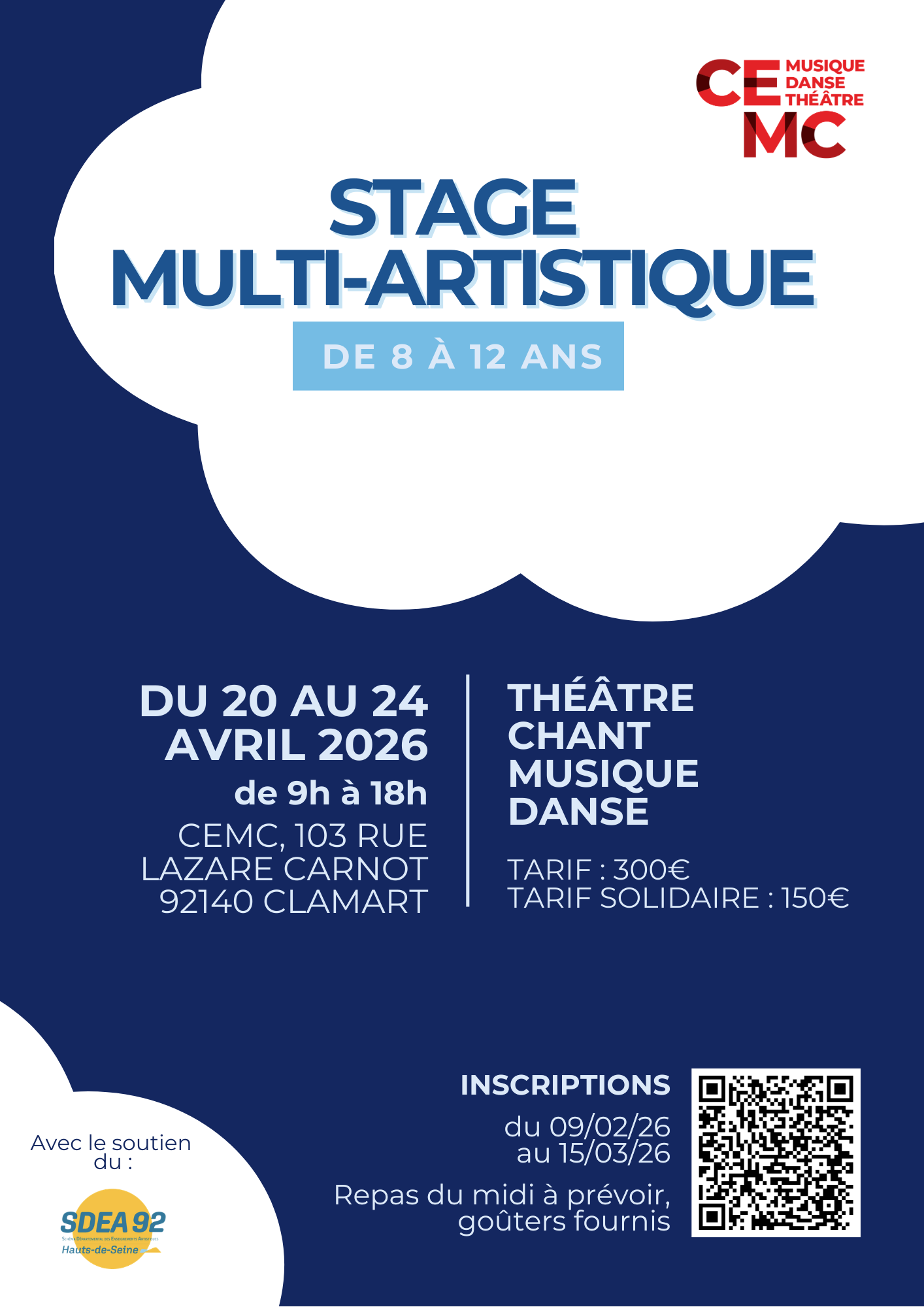 Grâce au soutien du SDEA 92, le Cemc peut proposer un tarif de 300€ pour la semaine de stage. Si vous n’avez pas les moyens de vous acquitter de ce tarif, vous pouvez bénéficier d’un tarif solidaire à 150€ pour la semaine.